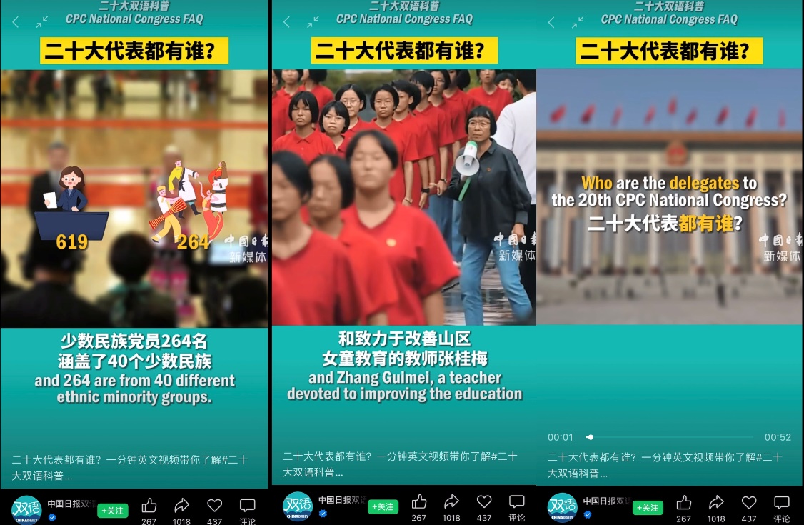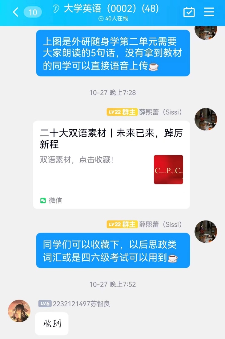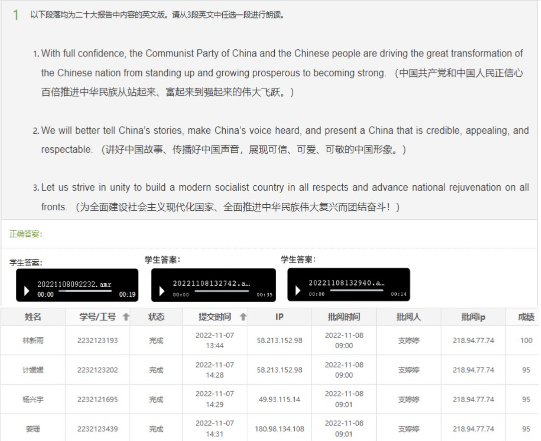 支婷婷老师将党的二十大报告“金句”英文版发布在“学习通”平台,课中带领学生进行学习,并布置了“二十大报告选读(英文朗读)”等课后作业,学生们纷纷提交了发音标准、清晰洪亮的朗读音频。
