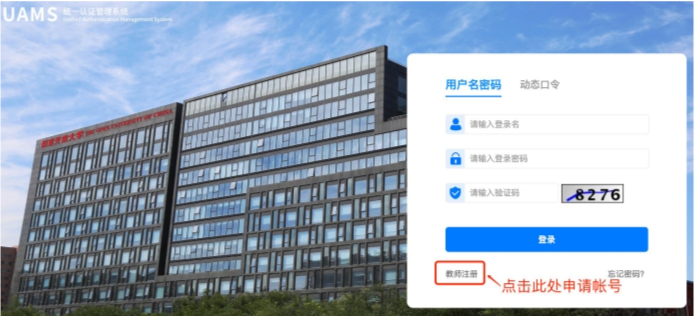 还未申请学习网账号的国家开放大学各分部、学院、学习中心老师可通过“一网一平台”统一认证门户(https://iamNaN.ouchn.cn/a m/UI/Login)自助申请帐号使用。详见下图: