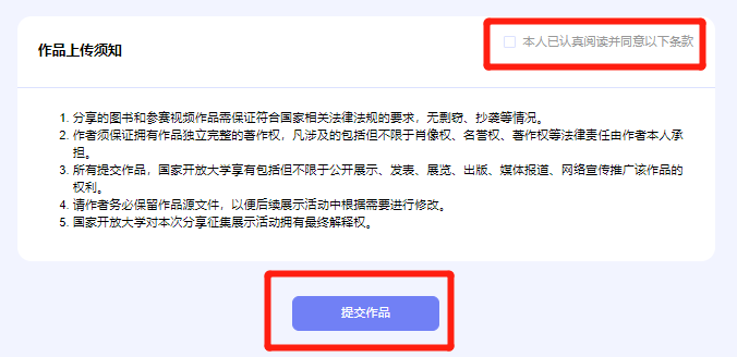 完成上述步骤后,在“作品上传须知”板块勾选“本人已认真阅读并同意以下条款”,然后点击“提交作品”,即可完成提交。