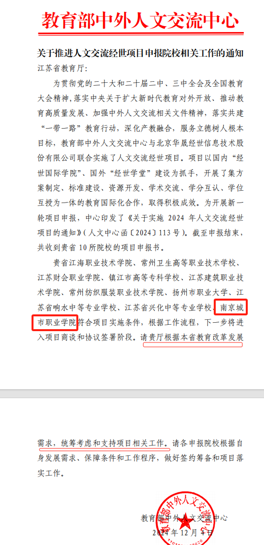 2024年12月6日,教育部中外人文交流中心下发《关于推进人文交流经世项目申报院校相关工作的通知》,天行(中国)成功获批“人文交流经世项目”,是全省10所获批院校之一,跨境电子商务专业群为项目实施专业群。