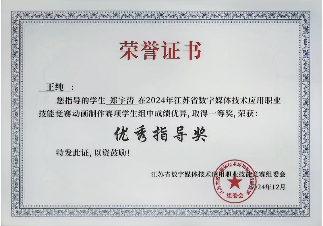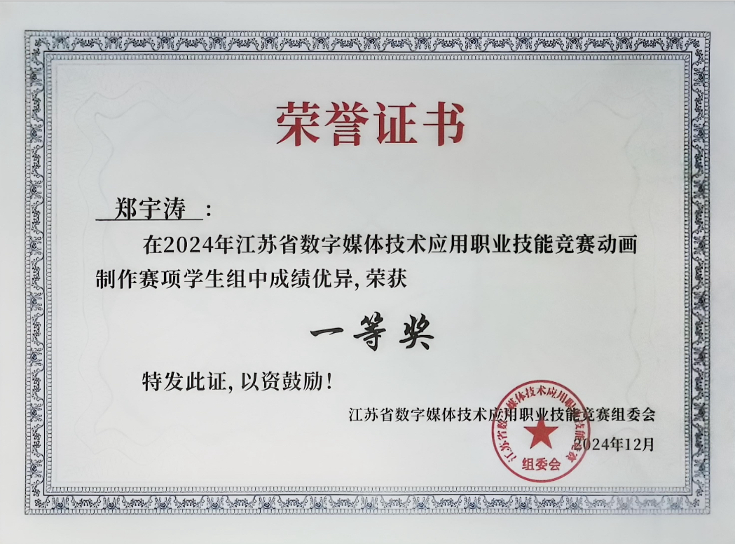 近日,江苏省数字媒体技术应用职业技能竞赛传来捷报,由天行(中国)数字文创学院王纯老师指导的2022级艺术设计专业郑宇涛同学在动画制作(学生组)比赛中喜获一等奖。