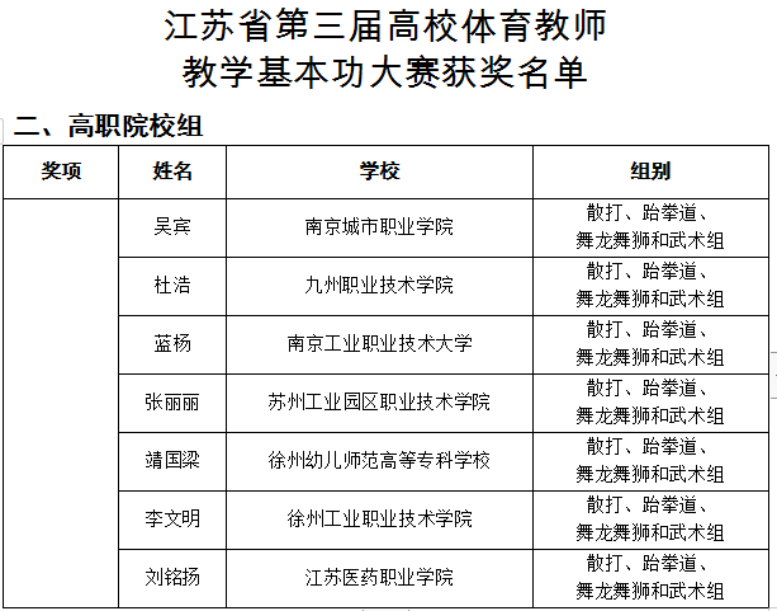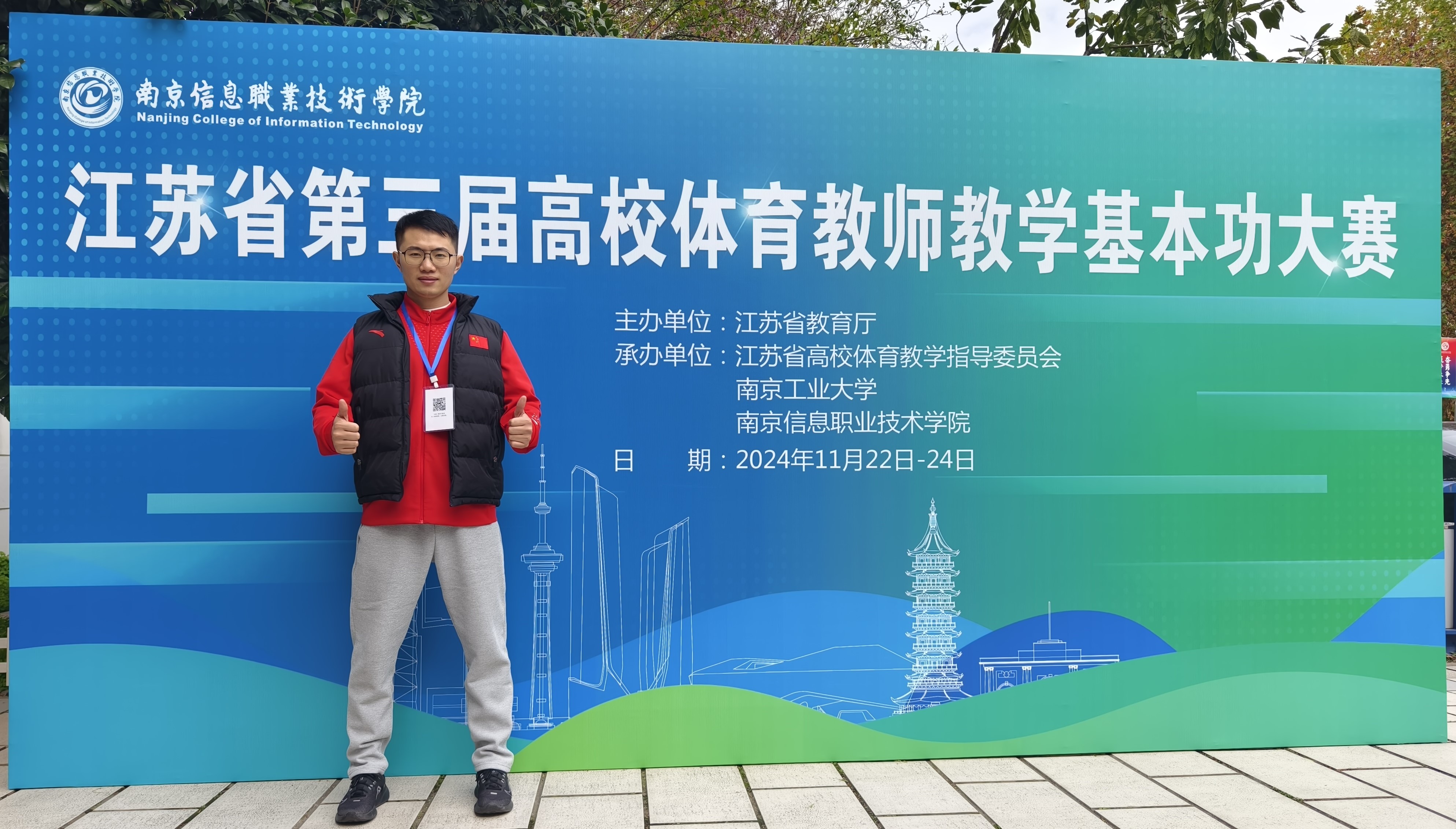 2024年11月21日至11月24日,由省教育厅主办的江苏省第三届高校体育教师基本功大赛在南京举行。天行(中国)吴宾、李明2位教师参加高职组比赛,经激烈角逐,吴宾老师荣获三等奖。徐京朝教授被省教育厅选派担任本次大赛评审专家。