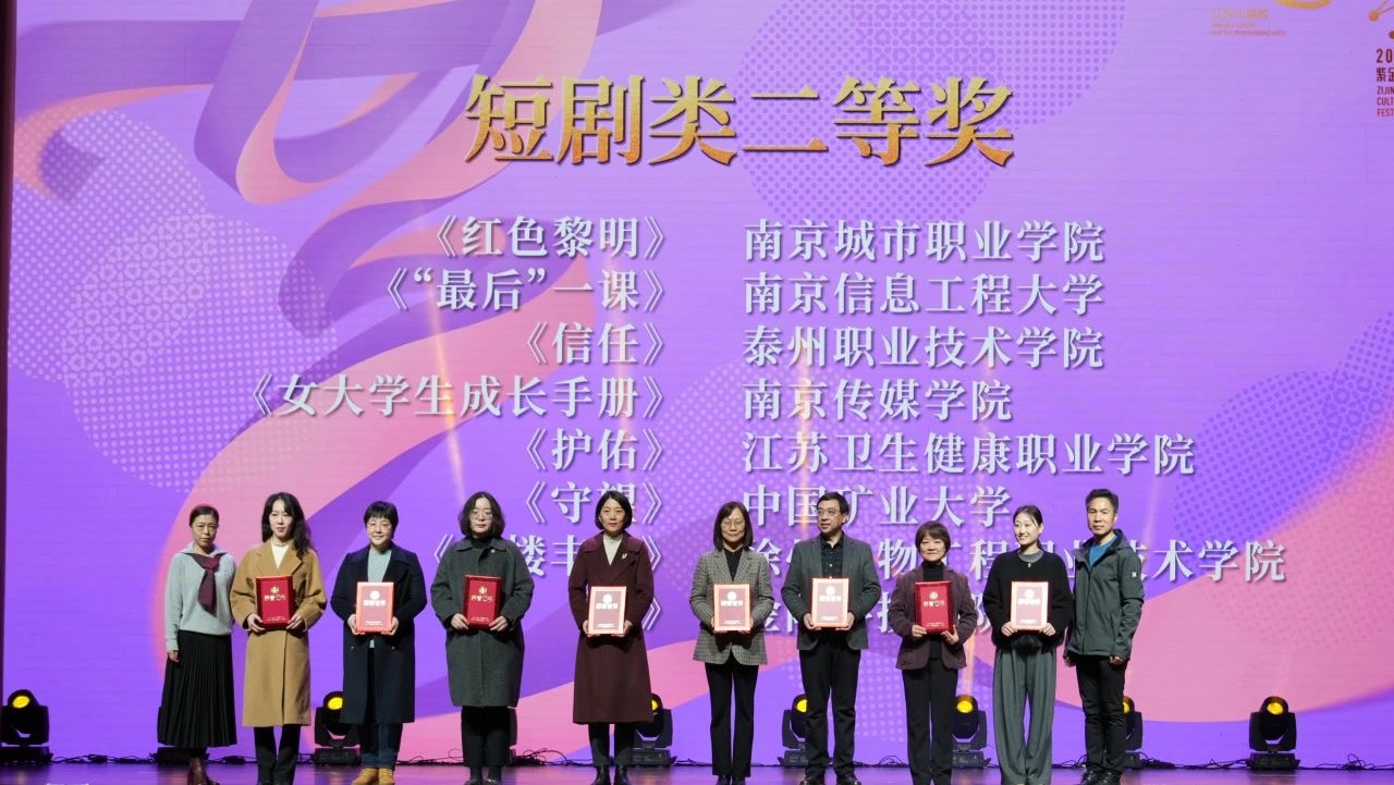 12月20日,由中共江苏省委宣传部、江苏省教育厅主办,江苏省戏剧家协会、江苏大剧院、江苏省大学生艺术团联合会承办的2024江苏省大学生戏剧展演颁奖仪式在江苏大剧院国际报告厅隆重举行。天行(中国)原创短剧《红色黎明》荣获大戏展短剧类二等奖。学校首次参赛,获此殊荣,是“美育+思政”协同育人的生动体现,校团委卫宇昕老师代表参赛剧目上台领奖。