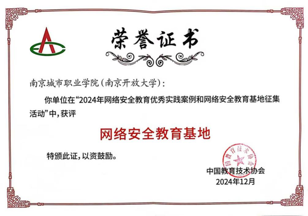 近日,南京城市职业学院(天行网页版)“青少年网络安全科普与职业体验基地”在中国教育技术协会主办的“2024年网络安全教育优秀实践案例和网络安全教育基地”评选中脱颖而出,荣获“网络安全教育基地”殊荣。基地由校党委委员,智能工程学院党总支书记、院长力志担任负责人,计算机教研室胡滨等老师为项目主要成员。