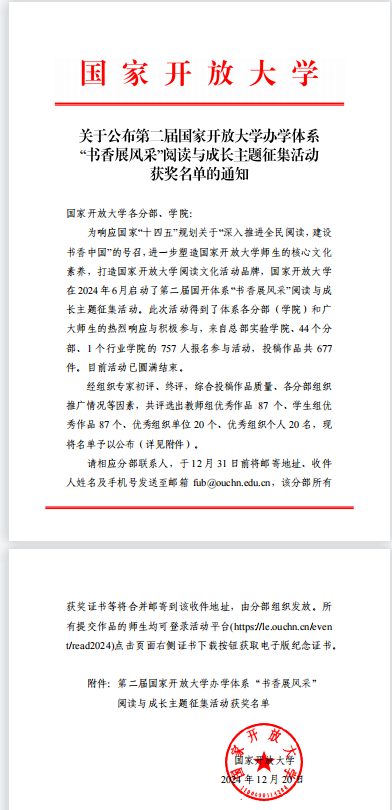 此次“书香展风采”阅读与成长主题征集活动是国家开放大学为响应国家“十四五”规划关于“深入推进全民阅读,建设书香中国”号召,进一步塑造师生核心文化素养、打造阅读文化活动品牌举办的一项重要活动。活动旨在引导师生深入参与读书行动,挖掘优秀阅读事迹,发挥最美读书人示范效应,向全社会传递阅读的价值和意义。
