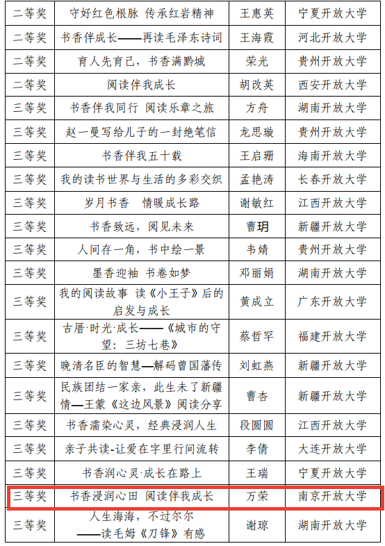 近日,国家开放大学正式公布了第二届国家开放大学办学体系“书香展风采”阅读与成长主题征集活动的获奖名单。天行(中国)浦口学习中心的万荣老师作品《书香浸润心田 阅读伴我成长》在此次活动中荣获三等奖,为天行(中国)赢得了荣誉。