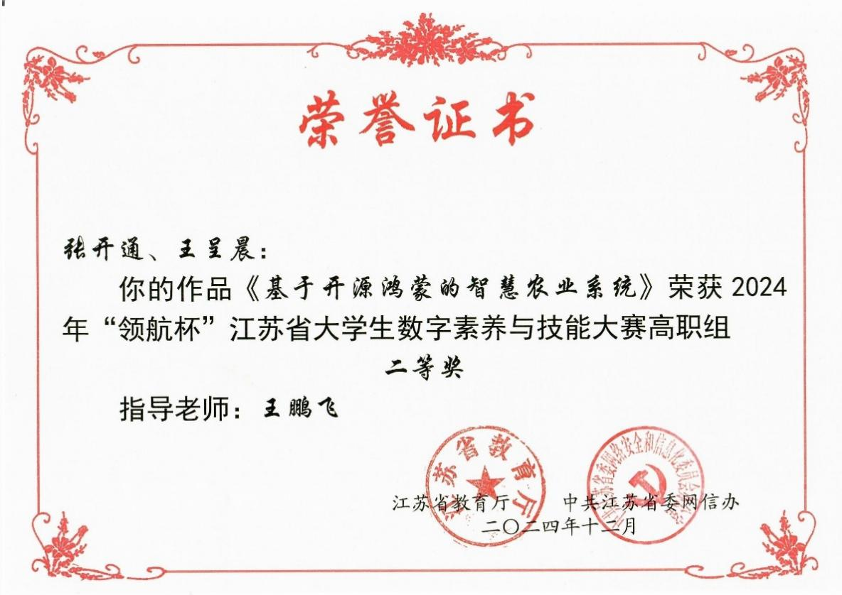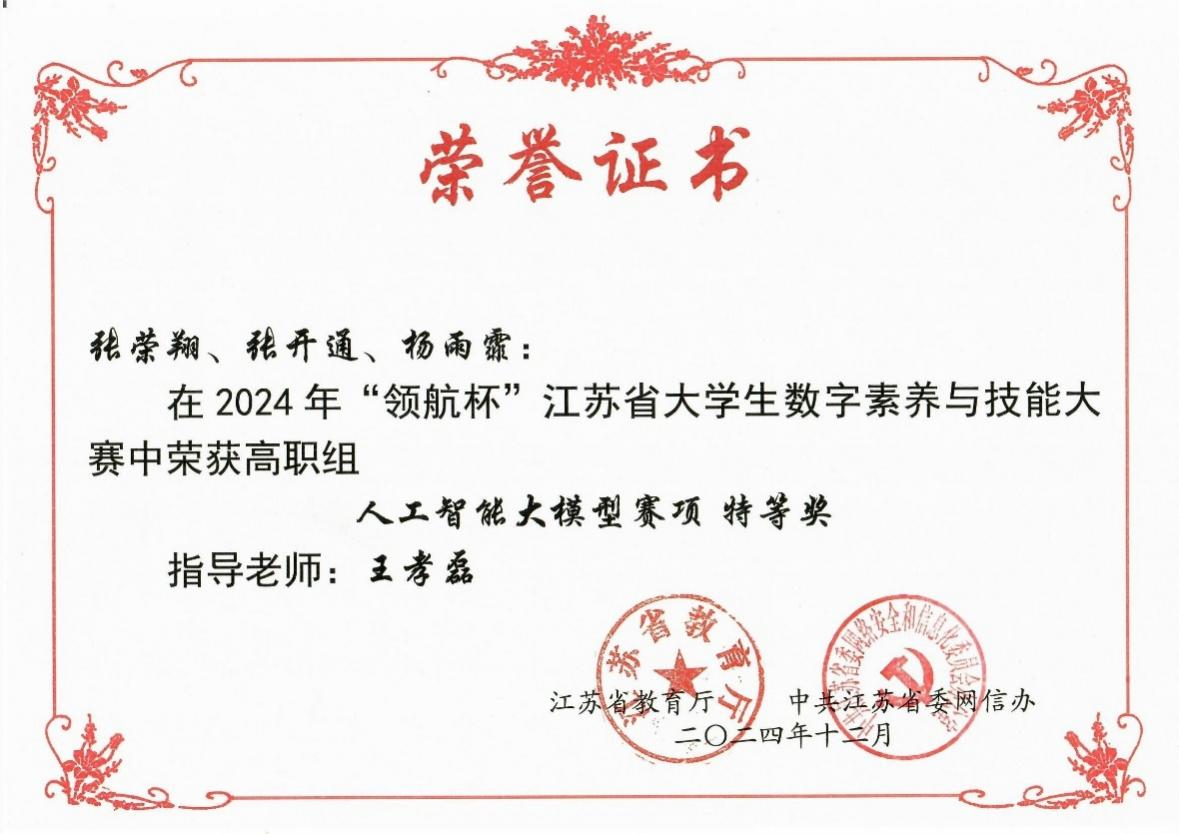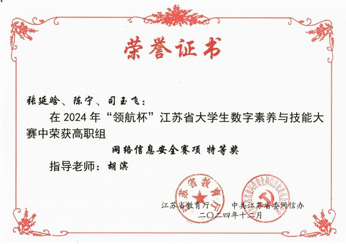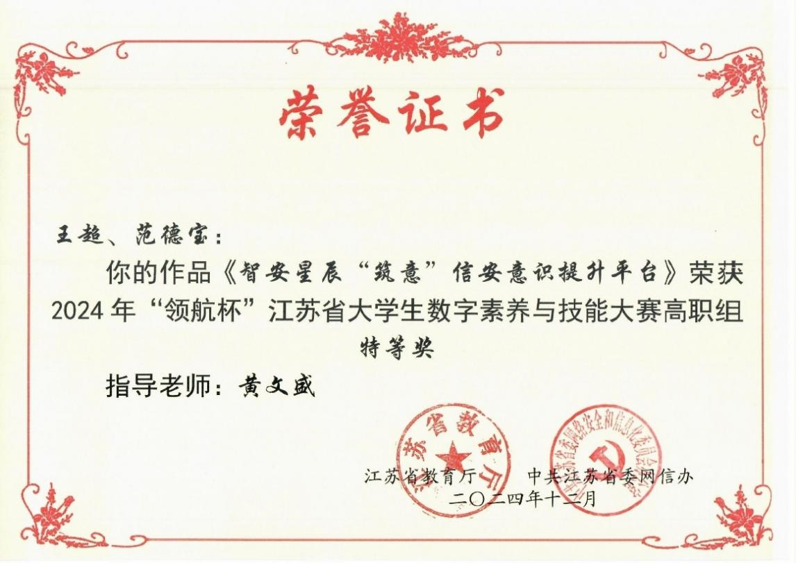 12月27日,2024年“领航杯”江苏省大学生数字素养与技能大赛顺利举办。天行(中国)代表队凭借扎实的专业素养和出色的技能表现,共摘取特等奖3个、二等奖2个。天行(中国)获优秀组织奖,胡滨、黄文盛、王孝磊、郭倩、王鹏飞老师获优秀指导老师奖。