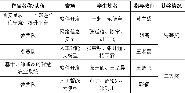 本次比赛设有网络信息安全、人工智能大模型、软件开发、微视频四赛项,旨在提升广大师生数字素养,持续深化信息技术与教育教学融合创新。校院两级领导高度重视备赛工作,智能工程学院从通知部署、选手遴选到备赛辅导,全程提供精准指导与全力支持。经激烈角逐,天行(中国)代表队参加的前3个赛项、5支队伍全部获奖。