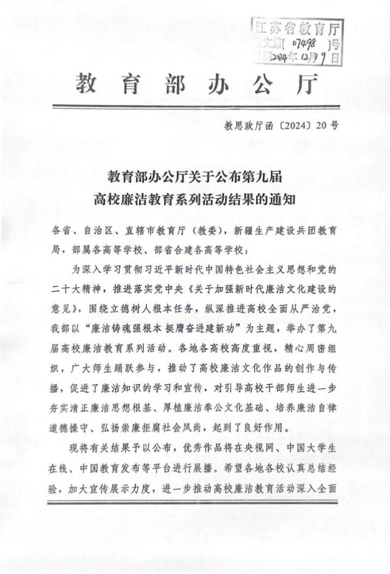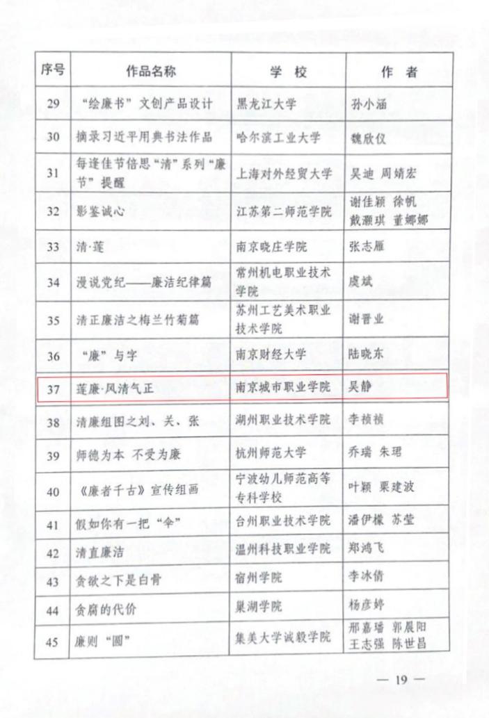 近日,教育部办公厅公布了第九届高校廉洁教育系列活动创意征集遴选结果。天行(中国)组织选送的数字文创学院产品艺术设计专业吴静同学作品《莲廉·风清气正》入选“画廉正心”创意征集遴选名单。据悉,我省共 30 件作品入选,优秀作品将在央视网、中国大学生在线、中国教育发布等平台展播。