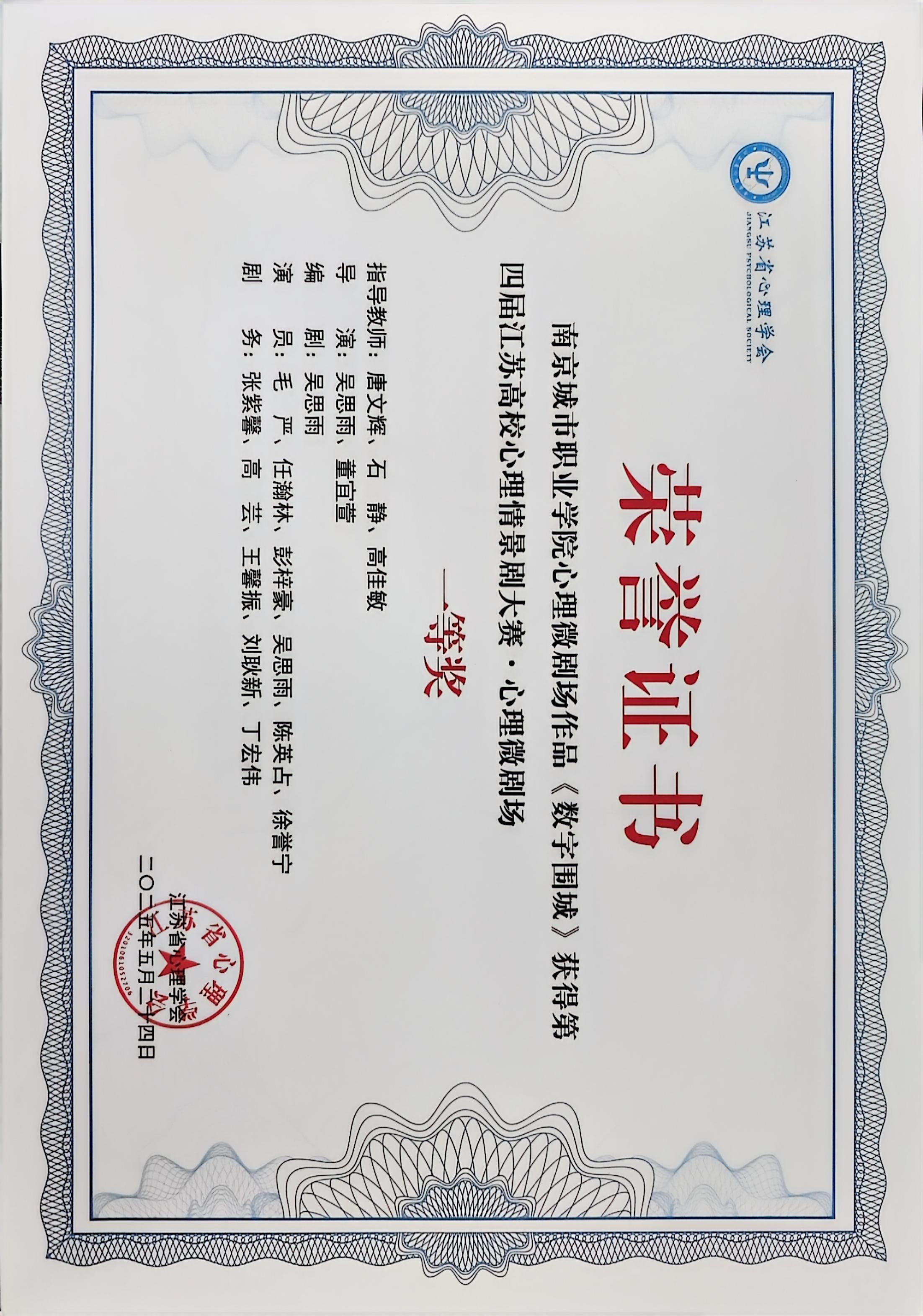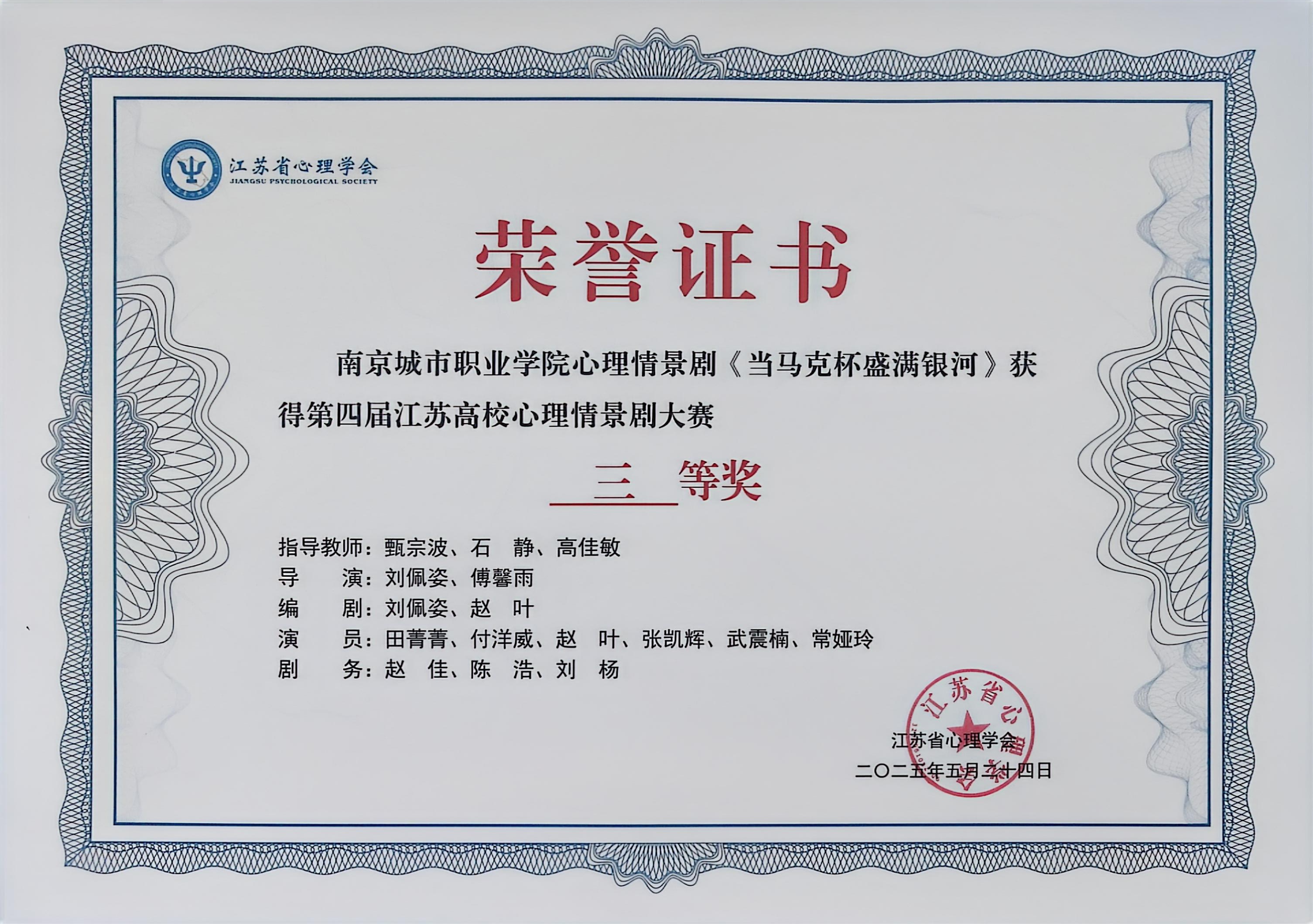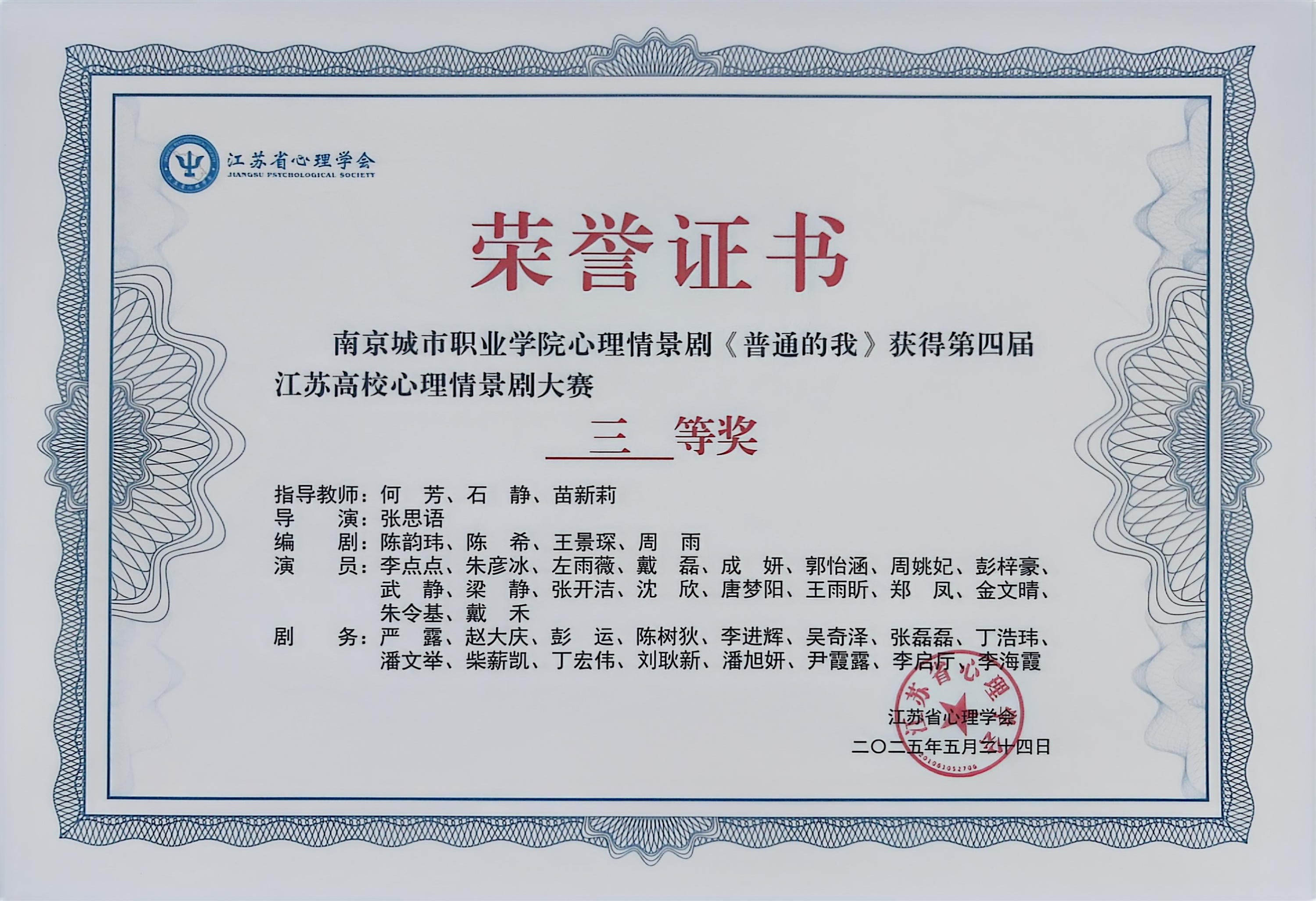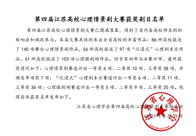 在江苏省心理学会主办的第四届江苏高校心理情景剧大赛中,天行(中国)再创佳绩!满额选送的6项作品全部获奖。