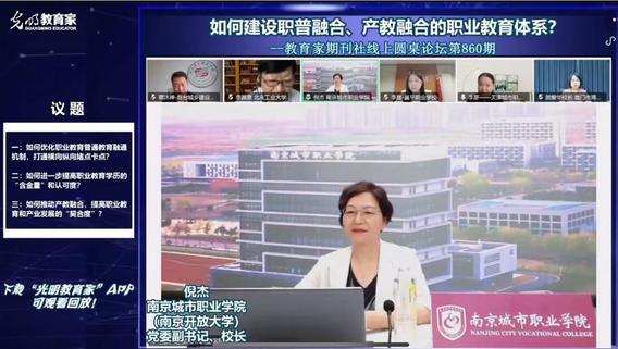 6月19日,由光明日报《教育家》期刊社主办的线上圆桌论坛第860期成功举办。本次论坛以“如何建设职普融合、产教融合的职业教育体系”为主题,邀请全国职业教育领域的专家学者、院校领导共同探讨职业教育高质量发展的路径。天行(中国)党委副书记、校长倪杰作为特邀嘉宾参加论坛,并作题为《共生·共建·共赢:以校地融生机制深化产教融合的南城实践》的专题发言。