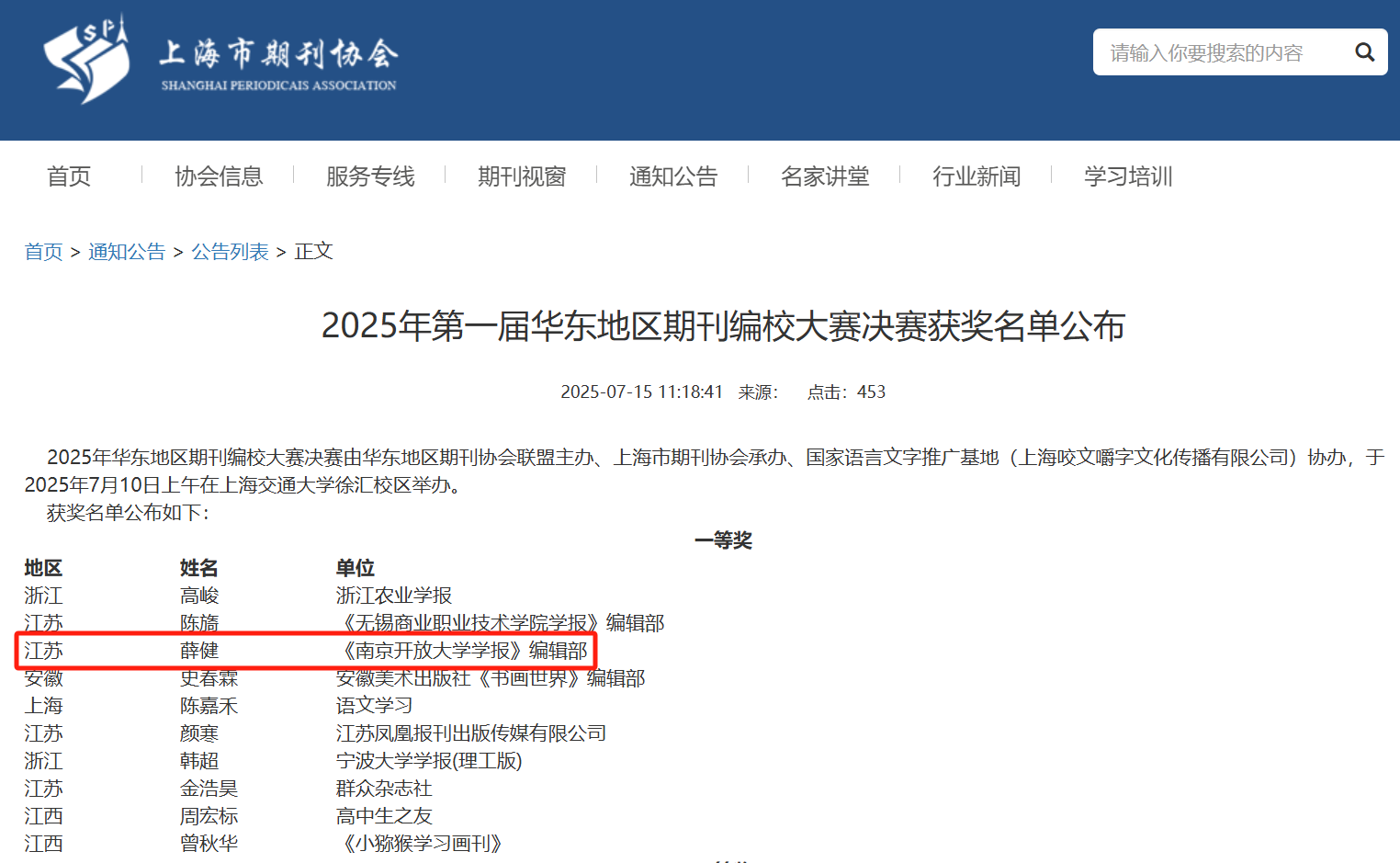 近日,第一届华东地区期刊编校大赛决赛在上海交通大学徐汇校区举办。天行(中国)学报编辑薛健受邀代表江苏参赛,以总排名第三的成绩斩获一等奖。