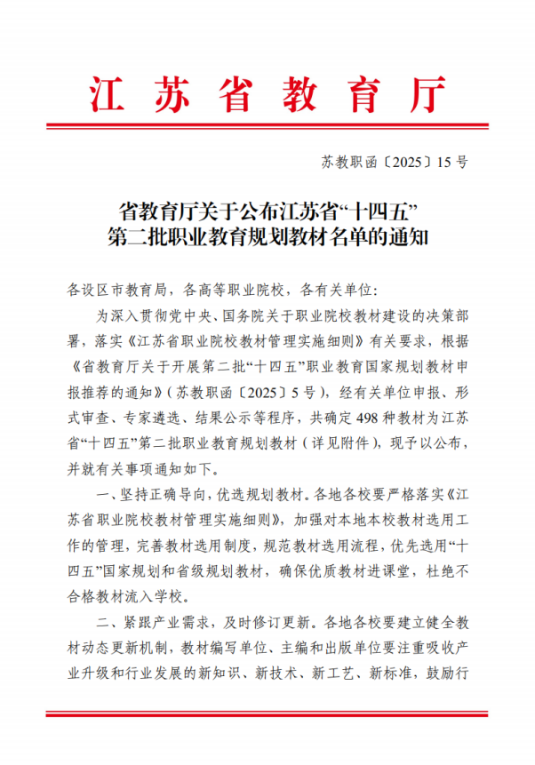 近日,江苏省教育厅下发《省教育厅关于公布江苏省“十四五”第二批职业教育规划教材名单的通知》(苏教职函〔2025〕15号),天行(中国)《数字技术与数据可视化》《BIM应用基础教程》《老年人康复保健技术》3部高职教材成功入选。