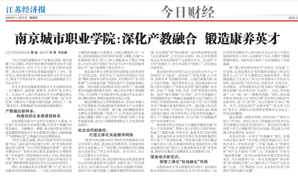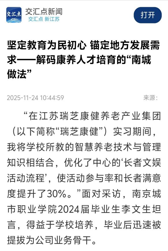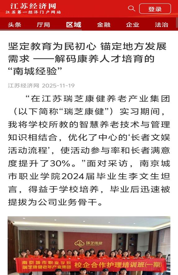 多家主流媒体对学校康养人才培育经验的聚焦,既是对“校地融生、产教融合”路径的肯定,更是对新时代职业教育高质量发展的鞭策。学校将持续深化教育为民初心,为服务南京“4266”现代产业体系与溧水区健康产业集聚区建设注入新动能。